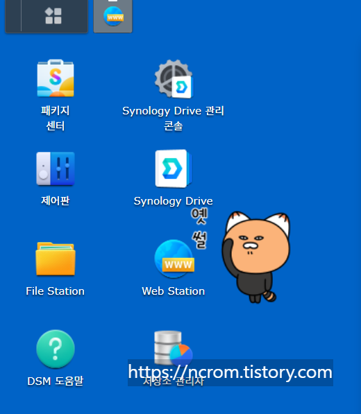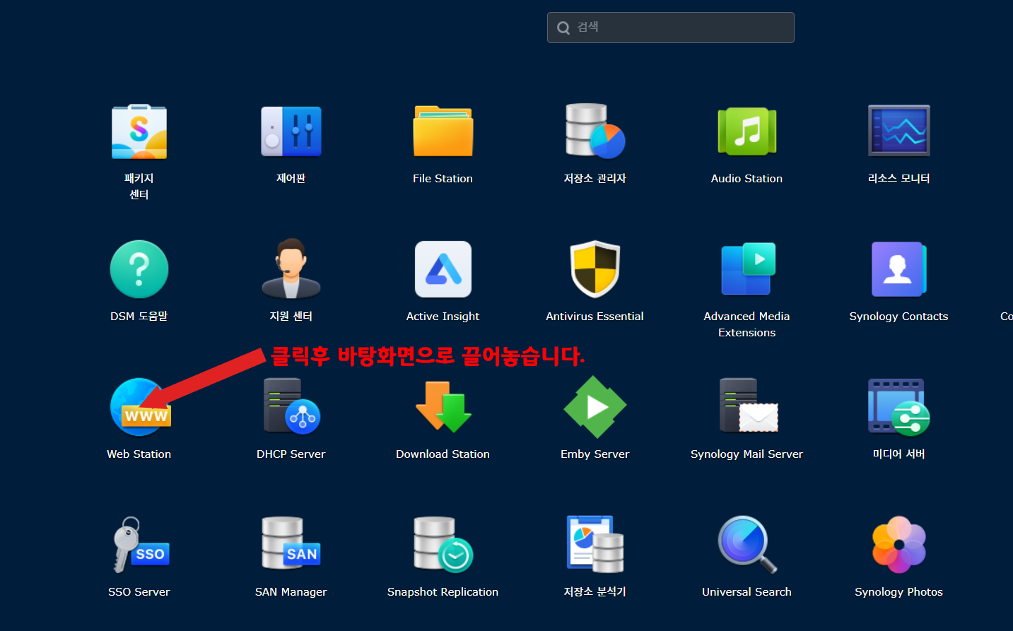 접속후 좌측상단의 아이콘을 클릭후 Web Station을 찾아 아이콘을 바탕화면으로 드래그 하여 놓습니다.
