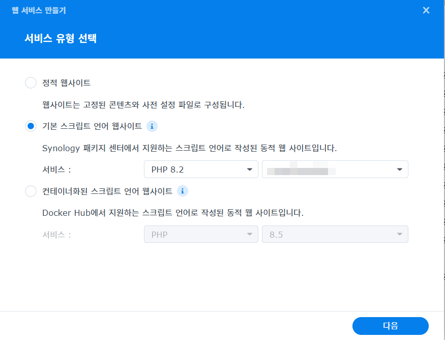 현재 글 작성을 하는 시점에 시놀로지 나스에서 지원하는 php는 8.2 밖에 없으므로 자동으로 PHP 8.2가 적용되었습니다.