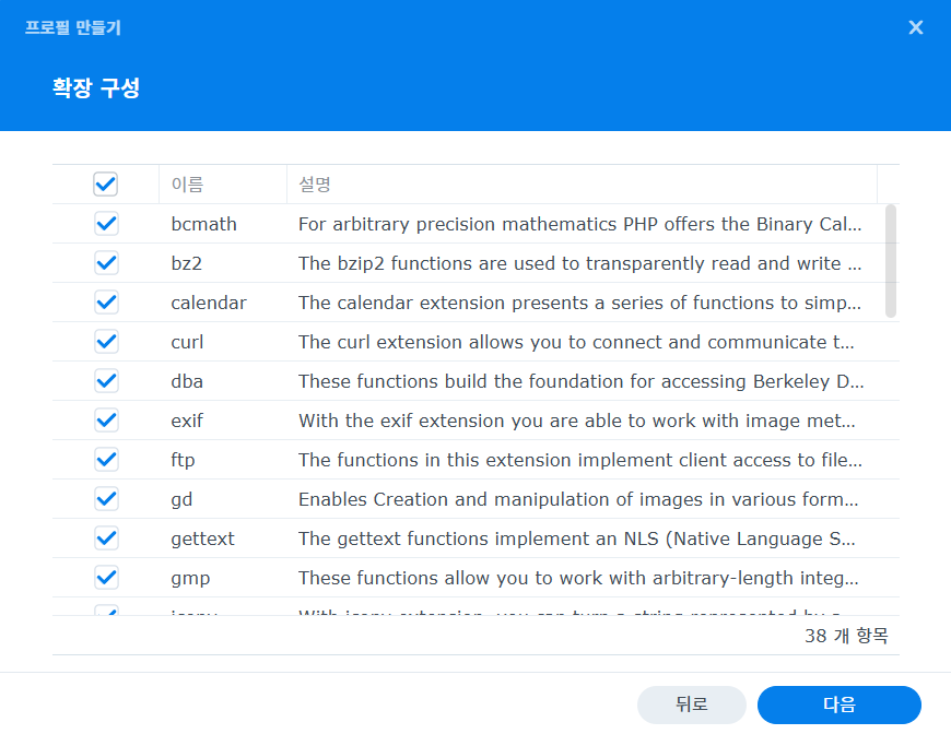 확장 구성 창이 나오는데 맨상단 체크박스를 체크하여 모두 선택 후 다음 클릭