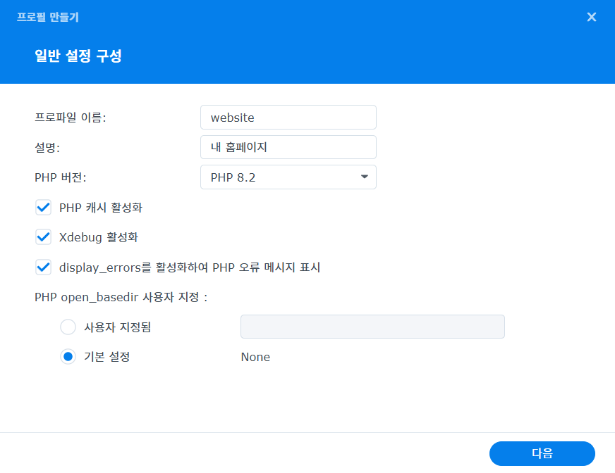 일반 설정 구성에서 프로파일 이름과 설명을 본인 사이트에 맞게 적당히 적어주고 php버전은 8.2를 해 줍니다.