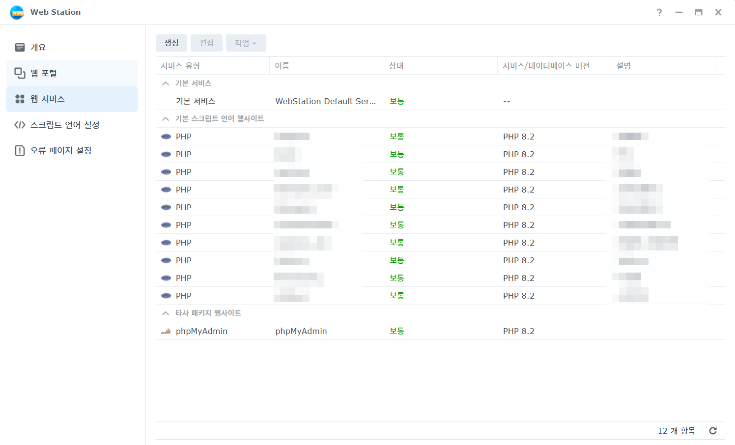 좌측메뉴에서 웹 서비스를 클릭하면 위와 같이 나오는데 맨 상단에 기본 서비스가 나오고 맨 하단에 phpMyAdmin이 있습니다.