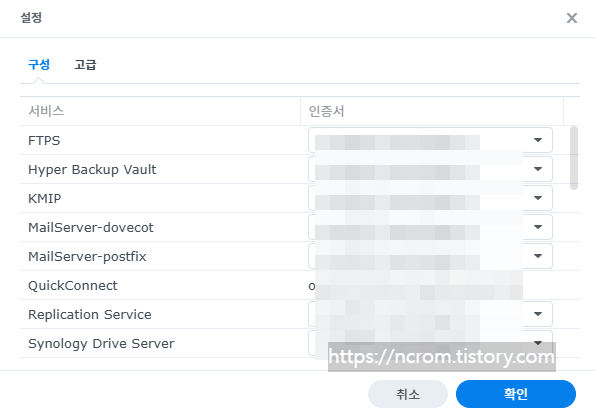 구성의 아래 항목들 중에서 조금전에 등록한 도메인 들을 찾아 우측의 목록버튼을 클릭하고 생성한 인증서로 연결한 다음 확인을 클릭합니다.