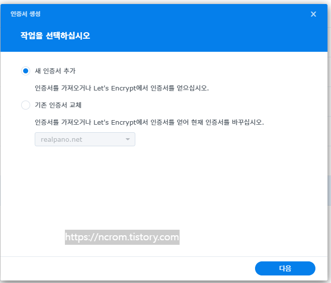 설명에는 인증서를 알아볼 수 있는 적당한 명칭으로 정해주고 두번째 Let's Encript에서 인증서 얻기를 선택후 다음