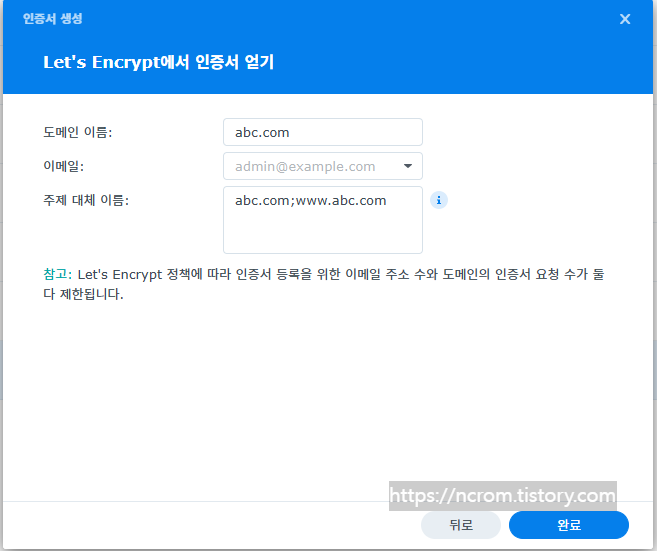 도메인 이름에 본인의 도메인 www 없이 abc.com처럼 적어주고 이메일 선택, 주체 대체 이름에는 abc.com;www.abc.com 이렇게 적어줍니다. 도메인과 도메인 사이엔 반드시 ;(세미콜론)으로 구분합니다. 마지막에는 ;을 넣지 않습니다.